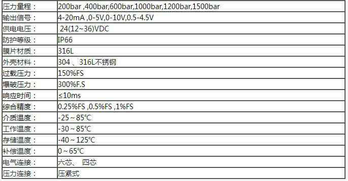 额定量程:200bar ,400bar,600bar,1000bar,1200bar,1500bar